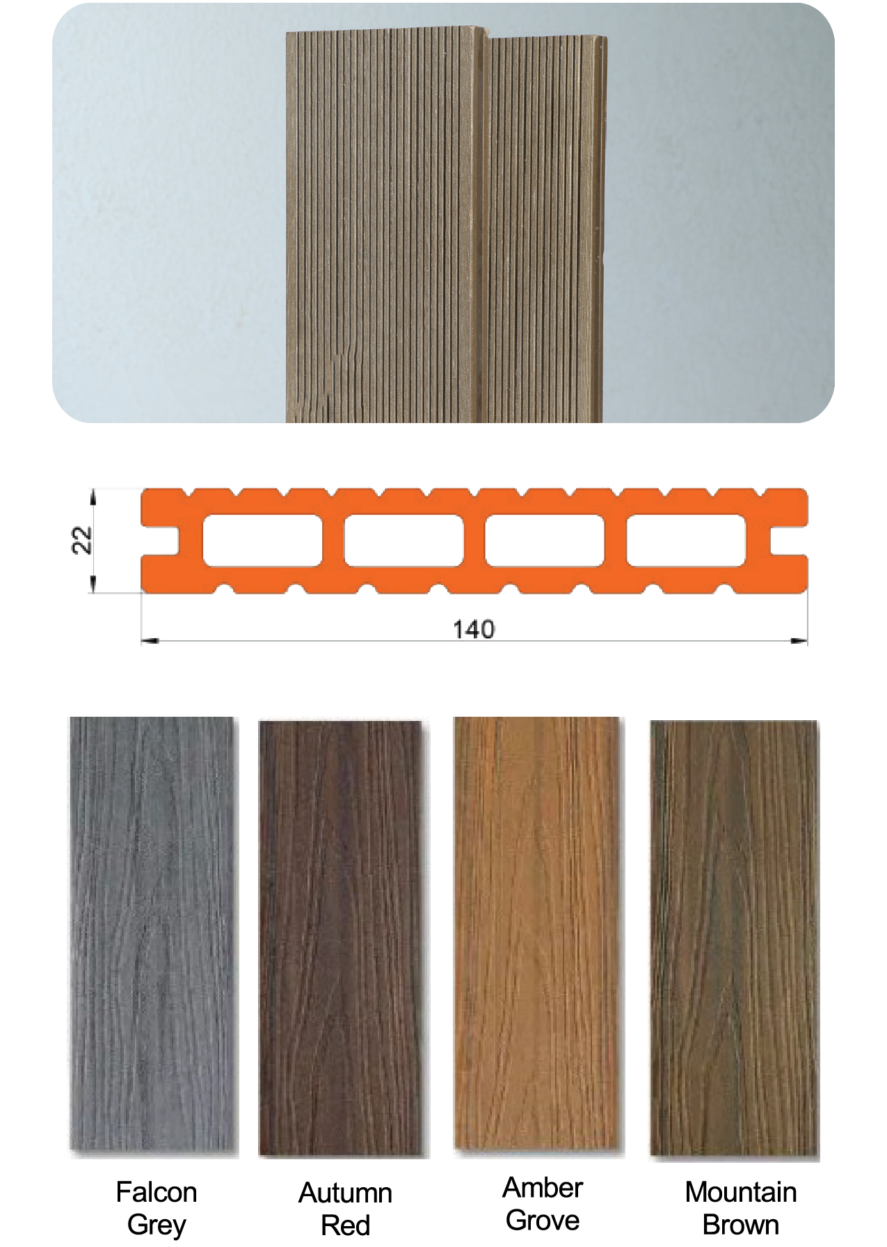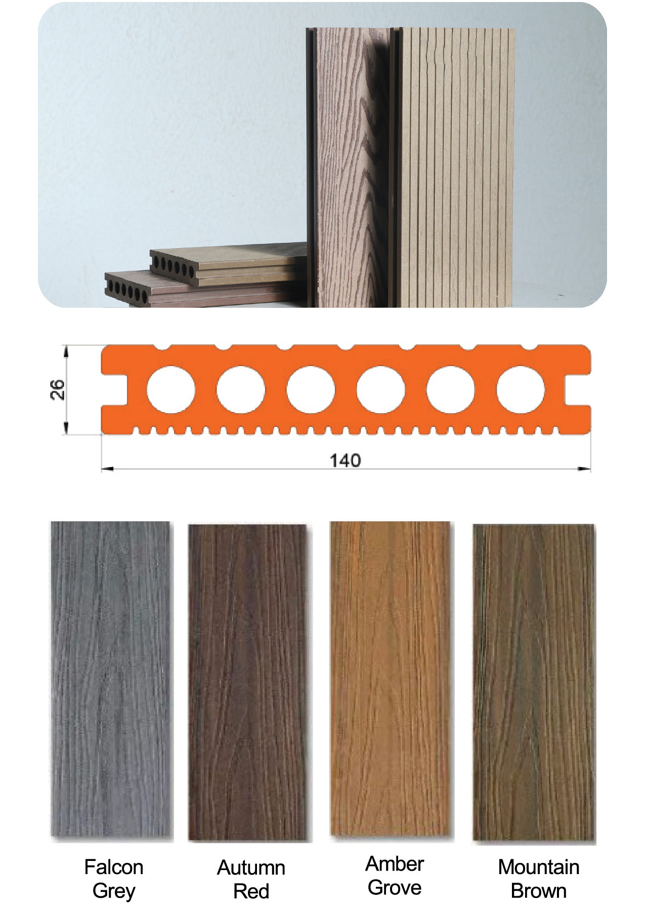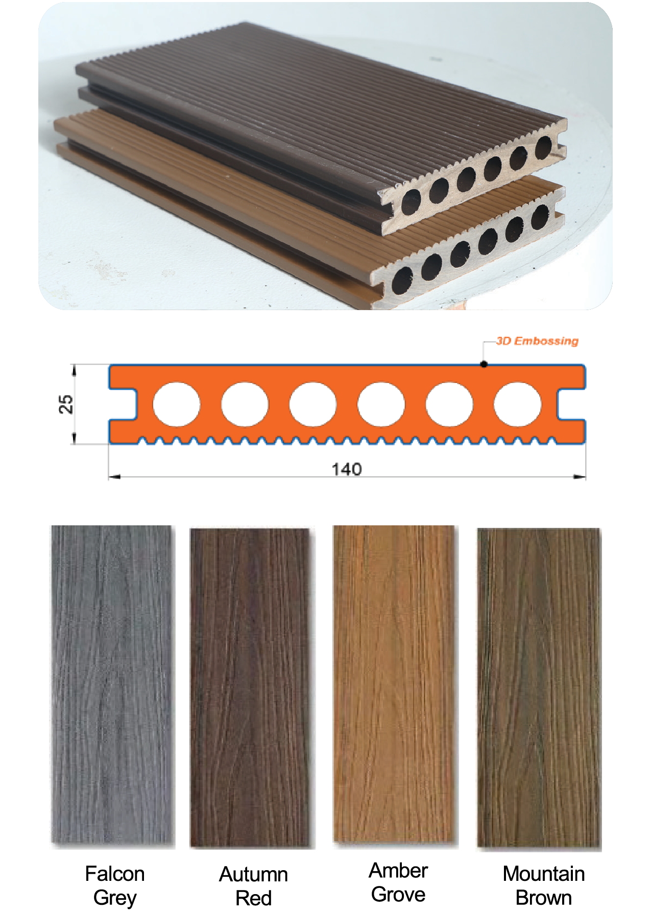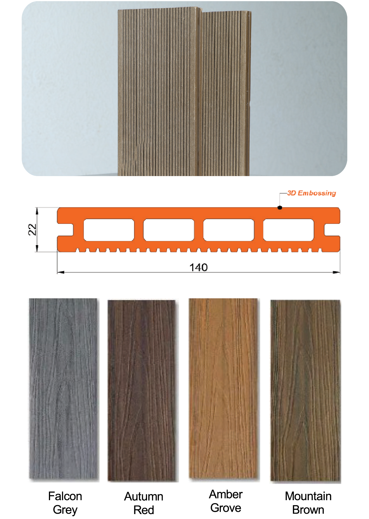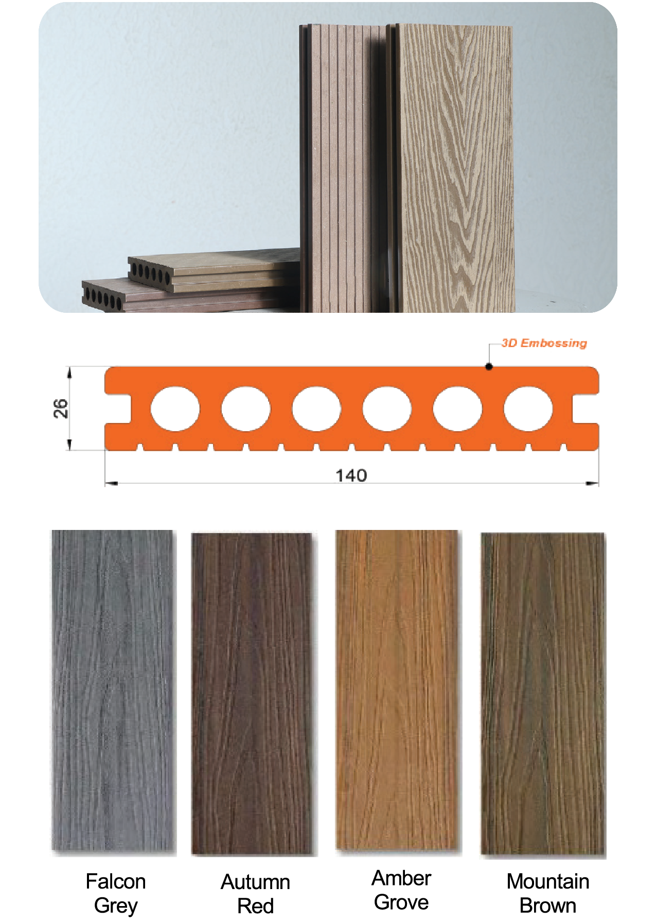 Decking is an exterior flooring solution that combines the traditional appeal of wood with the durability of plastic. Our WPC decking offers a sleek, modern design with enhanced aesthetics, providing a long-lasting and low-maintenance option for outdoor spaces.